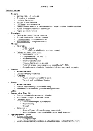 The following is a comprehensive guide containing lecture and lab content, summary tables and dot point facts. LECTURE CONTENT COVERED; Week 1 - Head + Neck Week 2 - Trunk Week 3 - Hip Joint Week 4 - Knee Joint Week 5 - Ankler Joint Week 6 - Foot + Gait Week 7 - Lower Limb; Dermatomes + Myotomes Week 8 - Pectoral Girdle Week 9 - NO CONTENT; BREAK Week 10 - Shoulder Joint Week 11 - Elbow joint Week 12 - Wrist Joint Week 13 - Upper limb; Dermatomes + Myotomes ALSO INCLUDED; Summary tables, and content put into dot-point form to assist with all 3 mini-tests and spotter tests. Each week is broken down into major points for to assist with the studying of the mini-tests. Due to Copyright all images were removed from this document.
