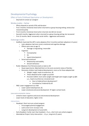 Concise notes covering all lecture content! Review these notes prior to exam to grasp key concepts! Includes additional quiz on Emotion topic. Topics covered: - Developmental psychology (early childhood deprivation, research designs, theories of development, language acquisition) - History of psychology (theories, mental health) - Social psychology (research methods, attitudes, prejudice/stereotypes, social influence, interpersonal behaviours) - Personality (research methods, theories) - Emotion (evolutionary theory, eyewitness testimony and lie detection)