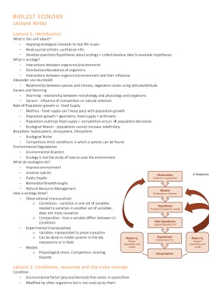 All lectures, detailed content with pictures. Super helpful to get through the unit as there is a tonne of content! :) Topics: - What is ecology? Ecologists, models, spheres - Conditions, resources and niche concept - Distribution - factors limiting, experimentation - Field Sampling - comparisons, stats - Productivity - global patterns, factors limiting - Effects of environment on life history - Community: diversity and species richness - scales - Biodiversity - extinction - Population Growth + Intraspecific Competition - carrying capacity, logistic+exponential growth - Interspecific Competition - effects, models - Predation - importance - Facilitation - commensalism, mutualism - Parasitism - lifecycles, parasite types, effects - Stanwell Tops Environmen - Community Structure: Disturbance and Succession, Island Biogeography - Food Webs - energy, efficiencies, residence, sources, nitrogen/phosphorous/carbon/hydro - Spatial subsidies - Ecological Impact Assessment - Restoration Ecology - Invasive species - Managed Ecosystems - Biological Responses to Climate Change