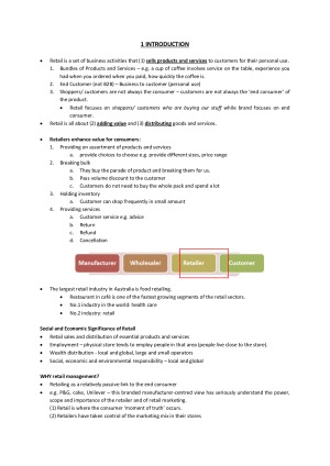 This is a summary of Brand Management week 1-12. There is no week 9 due to War Games. Week 1 - Introduction to Retailing Week 2 - Retail Channels Week 3 - Developing Retail Strategy Week 4 - Developing Retail Strategy Week 5 - Retail Positioning/ Retail Branding/ Brand Communication & Equity Week 6 - Merchandising & Buying Week 7 - Retail Pricing Week 8 - Retail Location & Store Environment Week 10 - From CRM to Big Data Week 11 - Retail Supply Chains/ Retail & Society (Ethics) This note is based onx the lecture and reading of Semester 1, 2018. Also, it includes some extra information. This material is ready for the exam. Very useful and contains explanations for certain aspects.