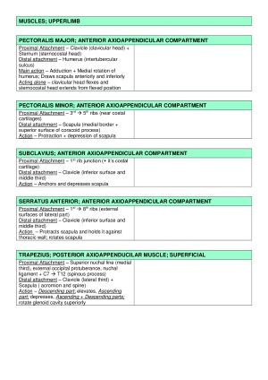 Study Aid for Spotter Test 2; Upper Limb ** PLEASE NOTE; All image have been removed for copyright. Information is presented in table format, and a space has been left to add images of structures. The following content relating to the upper limb is addressed; Muscles; Origins, Insertions, Actions, Innervation, Blood Supply ((Anterior Axioappendicular Compartment, Posterior Axioappendicular Compartment, Posterior Axioappendicular Compartlent (Superficial + Deep), Rotator Cuff Group, Anterior Arm Compartment (Superficial, Intermediate + Deep), Posterior Arm Compartment (Radialis Group, Superficial + Deep), Thenar Group (Intrinsic + Superficial), Hypothenar Group, Lumbricals, Interossei (Dorsal + Palmar)) Bones: All upper limb + their Bony Features Joints; Classification, Articulation, Action + Ligaments / Features (All Saddle, Synovial Plane, Ball + Socket, Synovial Hinge, Accompanying, Synovial Pivot, Synovial Condyloid, Synovial Saddle Joints) Ligaments: All upper limb ligaments attachments and functions Vasculature; Arterial Supply - Features, locations Vasculature; Venous Drainage - Features, locations Innervation; Brachial Plexus - All Roots, Trunks, Divisions, Cords + Terminal Branches ** IMAGES; Can br obtained from Kenhub, Teach Me Anatomy + University of Washingtons Muscle Atlas. **FINAL MARK FOR THIS SPOTTER WAS; 48/60; Distinction, using this study guide.