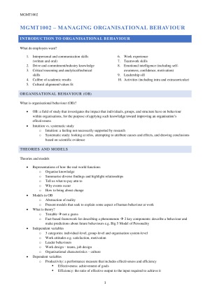 Topics: 1. Introduction to Organisational Behaviour 2. Personality and Individual Differences 3. Work Attitudes 4. Workplace Motivation 5. Leadership 6. Job Design 7. Fear & Stress 8. Turnover 9. Power & Conflict 10. Organisational Culture 11. Organisational Change