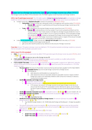 I completed this very enjoyable subject in 2018 Semester 1 These notes are very easy to use for the exam - I just copy+pasted the script and plugged in the variables; otherwise the notes are set out so you can apply as you go. Also includes heavy break down of issues step-by-step to cover everything relevant and explanatory notes and examples at stages where I got confused. The exam was online which is why the notes are a bit lengthy. However, these notes were all I needed to smash the exam - I did not refer to any outside resources apart from a calculator. My notes also include content from baby tax but only what is relevant to understand new content. I've made clear what content is new in Advanced Tax. Issues covered include: 1. Residency 2. International Double Taxation 3. Taxation of Dividends 4. Withholding tax 5. On-market share buybacks, OFF-MARKET SHARE BUYBACKS 6. Partnerships (unexaminable as this was the group project) 7. Taxation on trust income 8. Fringe Benefits Tax 9. Consolidated Groups 10. Anti-Avoidance Regimes 11. CFC Regime 12. Part IVA tax avoidance !Disclaimer - My notes pertain to 2018 Sem1 and focused purely on what was examinable - there may be minor errors/spelling in the unexamined content and I am not responsible for changes in the law. Goodluck! :)