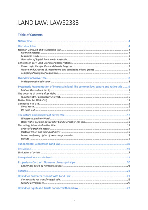 I used these note to achieve a distinction in Land Law in Semester 1 2018, specifically a HIGH DISTINCTION in the mid semester assignment. This is a fully comprehensive summary of ALL relevant topics and includes content necessary for answering the problem question and essay questions in the final exam. The following topics are covered: - Native title - Fundamental concepts in land law - Old system title - The Torrens system - Indefeasibility - Exceptions to Indefeasibility - Caveats - Co-ownership - Leases - Mortgages - Freehold Covenants - Easements