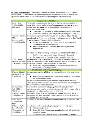 These notes cover the full LAWS1015 - Contracts course. They're concise and are organised to maximise your understanding of the ratio, important obiter and dissenting arguments, so that you can easily apply them in problem questions. Topics covered: - Introduction and History - Agreement: Offer and Acceptance - Certainty: Completeness, 'Agreements to Agree', Illusory Promises - Consideration - Intention to Create Legal Relations - Formalities - Estoppel: Common Law, Promissory, Proprietary, Approaches to Remedy - Terms: Pre-Contractual Oral Statements, Collateral Contracts, Incorporation, Implied Terms - Construction: Historical and Current Approaches, Codelfa - Exclusion Clauses - Privity - Discharge - Termination: By Agreement, Electing to Affirm, Restrictions, Effect - Failure of a Contingent Condition - Breach: Condition vs Warranty, Intermediate Term - Repudiation and Delay - Frustration