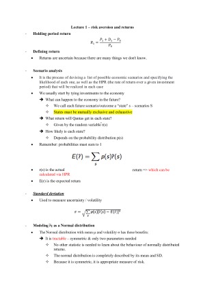 This note covers everything you need to know on this subject. You will survive with this note! Topics include - Lecture 1 – risk aversion and returns - Lecture 2 – Optimal Portfolio Choice - Lecture 3 – CAPM - Lecture 4 – Index Model - Lecture 5 – The Arbitrage Pricing Theory - Lecture 6 – Portfolio Performance Evaluation - Lecture 7 – Fixed Income Fundamentals - Lecture 8 – Coupon Bond (week 9) - mid sem test - Lecture 10 – The Term Structure - Lecture 11 – Managing fixed income - Lecture 12 - Floating Rate Bonds and Class Adjournment