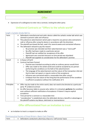 Comprehensive notes created using lecture/tutorial notes, the textbook, statutory and case law materials. These notes helped me achieve a high distinction mark in LAWS1015. These notes include: - all relevant legislation - all cases including their facts and principles - tips for solving problem questions Topics included: 1. Agreement 2. Certainty 3. Consideration 4. Intention to create legal relations 5. Formalities 6. Estoppel 7. Terms 8. Construction 9. Privity 10. Exclusion Clauses 11. Discharge by Performance 12. Discharge by Agreement 13. Discharge by Breach 14. Discharge by Failure of a Contingent Condition 15. Repudiation 16. Discharge by Frustration 17. Process and Effect of the Termination