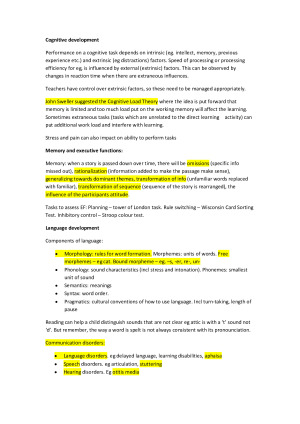 A highlighted subject overview, suitable for the exam. Topics: Cognitive development Memory and executive functions Language development Literacy Assessment of development Theory of mind Moral development Physical development motor development emotional development personality gender development self concept and self esteem sibling relationships peer relationships social skills prosocial and antisocial behaviours emotional health health and wellbeing
