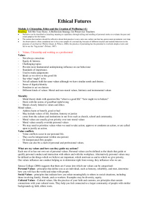 Detailed notes used for quiz and received 20/20! Module 1: Citizenship, Ethics and the Creation of Wellbeing (v1) Topics Include: 1. Values, Citizenship and working as a professional 2. Ethics: Principles and Frameworks 3. Wise professional practices: Models and Tools