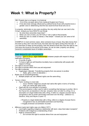 Covers whole semester of Property Law content with examples and answers. Notes include: - What is property - Possession - Tenure/ Estates - Creation and Transfer in Land - Competing Proprietary Interests - Torrens Title Land - Indefeasibility - Unregistered Interests - Mortgages - Co-ownership