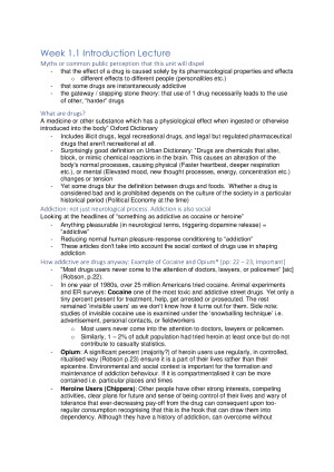 Taken over Semester 3 (2018) A concise combination of lecture notes and most mandatory readings that will assist you in quizzes that are posted. Easy to understand, easy to navigate, no stress. List of Topics Covered: Week 1: Introduction, Ethnographies of Drug Use, Psychedelics/Hallucinogens, Drugs and Symbolism, Drug Law Reform Week 2: Cannabis, Cocaine Week 3: Neuropharmacology, Drugs of Abuse, Drug Abuse and Addiction, The War on Drugs, NSW Law Enforcement Perspective on Drugs, Drugs and Incarceration, Alcohol Drugs and Indigenous Australia Week 4: Political Economy of Opiates, Political Economy of Tobacco, Sacred Tobacco Week 5: Erectile Dysfunction Drugs, Imagining American sexuality in debates over access to contraceptive pills, Steroids, Placebo Effects