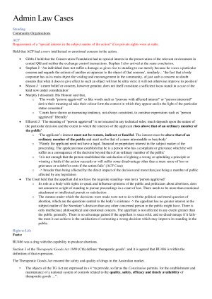 These notes are include three separate sections: 1) FULLY DETAILED CASE NOTES 2) FULLY DETAILED NOTES REGARDING CONCEPTS IN ADMINISTRATIVE LAW 3) FOCUS AREAS FOR PROBLEM SOLVING QUESTIONS The first 2 sections are very useful for the essay assessment components of the course, and the 3rd section can be used for the problem solving component in the mid semester. I have included in the preview a page of each section. Overall, the notes cover: Intro to Administrative Law and the Australian Admin Law System Intro to Judicial Review The Scope of Judicial Review under Statutory Sources of Jurisdiction Supervisory jurisdiction of State Supreme Courts Review of delegated legislation Judicial Review Remedies and the centrality of jurisdictional error What are jurisdictional errors? Remedies The consequences of invalidity Intro to Grounds of review; Procedural Fairness hearing rule Rule against bias; statutory procedures Relevant and irrelevant considerations; unauthorised purposes The role of policy in decision-making; dictation; delegation Fact/Law distinction; Jurisdictional facts Legal reasonableness and human rights norms Standing Statutory restrictions on judicial review