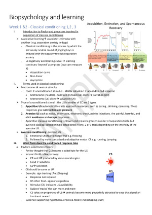Detailed lecture notes on the following topics: Classical conditioning, contingency, operant conditioning, extinction in operant conditioning, punishment, behavioural neuroscience, nervous system, neurophysiology, neurotransmitters, substance abuse, neurobiology of learning and memory