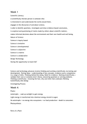 Weekly summary from weeks 2-11 (No summaries for 1 + 12 as they were explaining the unit/summarising the unit) Topics: Study of relevant national, state and systemic policy and curriculum statements to set the context for the Australian Curriculum: Technologies within the Foundation to Year 6 context Study of the aims, objectives, outcomes, content and assessment requirements of the relevant Australian Curriculum: Technologies Examination of a range of theoretical frameworks relating to teaching of and with technologies Approaches to planning and development of project-based teaching and learning strategies Teaching and learning strategies, that include the general capabilities and cross-curriculum priorities, to meet a range of student learning styles and prior experiences Digital Technologies processes and production skills – defining and solving problems through using digital systems, critical and creative thinking and applying computational thinking The language and literacy of the technologies Ethics, values and contemporary influences involved in the teaching of the technologies subject. No readings covered. Just lecture and tutorial summaries.
