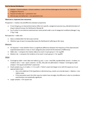 Comprehensive notes that can be used in the open book practical exam. Includes steps on how to complete relevant statistical tests using Graphpad Prism software. Descriptions are also provided to help decide which test to perform. Information is more condensed than the practical handouts, so easy to navigate during the exam. These topics are covered in preparation for the practical exam: Categorical Data, Reliability, Sample Size Correlation and regression Parametric tests (t tests and ANOVA) Multivariate analysis, non-parametric approaches