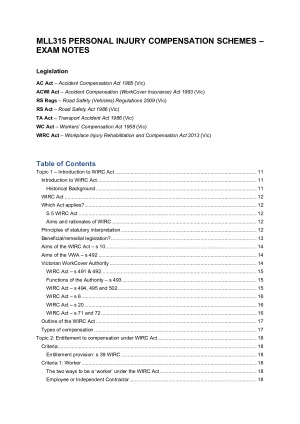 T3 2018 Deakin notes including case summaries and legislative snippets. Notes are a mixture of topic summaries and lecture material. No textbook for this subject. Topics covered: 1. Intro to WIRC Act 2. Entitlement to compensation under WIRC Act 3. Types of compensation under WIRC Act 4. Common law (Serious Injury Applications) under WIRC Act 5. Intro to TA Act 6. Entitlement under TA Act 7. Types of compensation under TA Act 8. Common law (Serious Injury Applications) under TA Act 9. Interaction between WIRC Act, TA Act and other Acts 10. Claims procedures and ADR in WIRC Act and TA Act