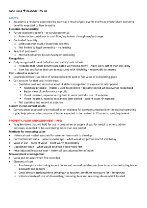 complete notes on entire ACCT1511 course from semester 2, 2018. Author received a high distinction, 88. Highly recommend looking at notes throughout this course. COVERS ALL TOPICS INCLUDING: 1. Assets 2. Liabilities 3. Financial Statements 4. Cash Flow Statements 5. Accounting Policy Choice 6. Costing
