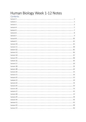 Comprehensive notes for Human Biology. Includes notes for all content from Week 1-12, formatted and written for easy understanding (and to avoid being overwhelmed with the amount of content in this subject) Topics covered include: * Homeostasis * Cell structure (lipid bilayer, organelles + cytoskeleton) * Cellular transport systems * Tissues (with a major focus on epithelium) * Anatomical terminology (body regions + cavities) * Medical imaging * Integumentary system (skin + hair) * Skeletal system (bone structure + growth) * Joints * Muscular system * Nervous system (both central and peripheral) * Endocrine system * Blood * Cardiovascular system * Lymphatic system * Immune system (innate + adaptive) * Respiratory system * Digestive system * Urinary system * Sexual reproduction (genetic processes, male + female systems) * Embryonic development (from pre-fertilisation to birth) These notes were compiled by a Human Biology tutor, so you can trust that the information is both correct and focused on what you need to know for exams.