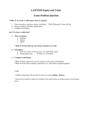 Examinable topics covered 1. Nature of a trust 2. Certainty of intention 3. Certainty of subject 4. Certainty of object and standard of certainty 5. Trusts for charitable purposes 6. Trusts for recognised anomalous purposes 7. Formalities for declaration of trust 8. Complete constitution 9. Personal remedies for breach of trust 10. Proprietary remedies for breach of trust 11. Fiduciary duties 12. Breach of confidence Includes step by step guides for answering problem questions Grade: Distinction