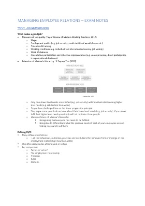 Comprehensive notes that I used to revise for the final exam!! Covers all topics from lectures and tutorials, summarised in a succinct manner and easy to read and revise from. Topics Covered: -foundations of ER -job quality, engagement and employee voice -actors of employment (employers and managers) -unions -the state and the rules of work -conflict at work -negotiation -regulating diversity, safety and dismissal -collective bargaining