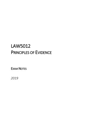 Exam notes created in Trimester 1 2019 for LAW5012 Principles of Evidence (Monash JD). These notes are designed to act as a clear and concise checklist. They clearly go through each step that must be considered in an exam, and are filled with clear authorities. These notes have been colour coded for ease of use. These Notes Include: -Introduction to Evidence -Relevance -Competence & Compellability -Privilege -Examination of Witnesses -Character and Credibility -Tendency and Coincidence -Hearsay -Right to Silence -Admissions -Illegally/Improperly Obtained Evidence Note: For the best preview of the notes, view the 'preview' on a non-mobile device. Disclaimer: The accuracy of these notes is not guaranteed