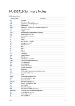 Comprehensive notes for HUBS1416. Complete with a table of contents, abbreviations list, diagrams, flowcharts and flash cards. I received an HD in the final exam by creating and studying these notes. I encourage you to use these notes only as a study guide and to attend lectures and take your own notes. Topics covered include: - Nervous system - peripheral and central - Pharmacology - Microbiology - Immunology - Genetics
