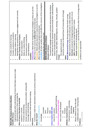 1 page back/front exam notes used in first year science. Topics: - Purpose of Science Education - The Nature of Science - Doing Science - Literacies of Science - Thinking Scientifically - Assessing Science Understanding - Talking Science - Scientists Thinking About Science - Starting to Teach Science - Science in everyday lives