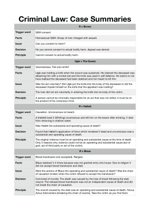 Each case includes trigger word, facts, issue, decision and key legal principle. R v Brown Ugle v The Queen R v Hallett R v Blaue Fagan v Metropolitan Police Commissioner Thabo Meli v R R v Ireland Ryan v Kuhl Zanker v Vartzokas Rosza v Samuels Tuberville v Savage R v Campbell R v Westaway R v Absul-Rasoel R v Wilson Pallante v Stadiums Pty Ltd Ryan v R DPP v Farquharson R v Smith R v Pagett Royall v R R v Evans & Gardiner R v Clarence R v Linekar Papadimitropoulous v R R v Gallienne R v Mobilio Zeceric v DPP Osiand v R R v O'Connor R v Crabbe Boughey v R Wilson v R Nydam v R R v Lavender R v Taktak