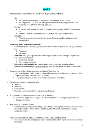 Fully detailed notes for ATS2561: Sex and the Media. They cover all content from weeks 1-11 (a broad unit summary took place in week 12) and include notes from lectures, tutorials and relevant readings. They also include an important timeline, several diagrams and some helpful links. These notes led to me obtaining a High Distinction in the unit overall. They are all you need to do well in ATS2561! Topics: -Frameworks and key issues -Print and advertising -Film and television -Music videos -Pornography -Cybersex -Video games -Social Media 1 & 2 -Hook-up and dating apps -Sexting and doxing