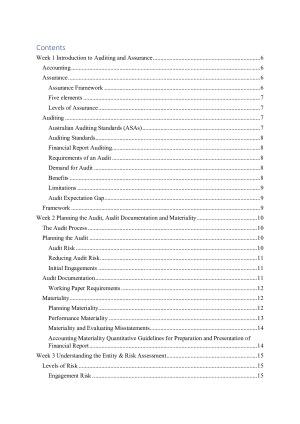 Weeks 1-11 Introduction to Auditing and Assurance Planning the Audit, Audit Documentation and Materiality Understanding the Entity and Risk Assessment Financial FReport Assertions, Internal Controls and Tests of Controls Audit Evidence, Auditor’s Procedures in Response to ASssessed Risk and Audit Strategy Analytical Procedures, Audit Sampling, using the work of others, Governance and the Auditor, Audit Committees and Internal Auditing IT Systems and Audit Analytics Auditor’s Legal Liability, Ethics and Audit Quality Completing the Audit, Subsequent Events, Going Concern and Audit Reporting