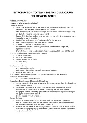 Extremely detailed notes consisting of information presented in lectures, tutorials and textbooks. Includes a variety of essential quotes for assessments and exams, as well as textbook chapter summaries and tutorial information. Topic List: - Week 1: Why teach? - Week 2: What makes an effective teacher? - Week 3: Classroom management for learning - Week 4: Psychological principles as foundations for learning. Acknowledging learner diversity - Week 5: Social and emotional wellbeing and mental health of students - Week 6: Curriculum frameworks - Week 7: Introduction to lesson planning - Week 8: Introduction to assessment and reporting - Final: Exam revision topics