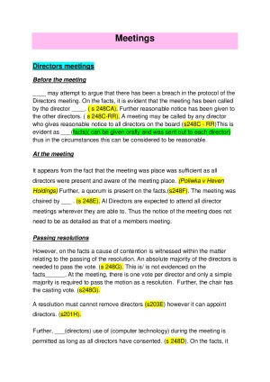 These notes are scaffold exam answers with detailed explanations of the cases. They cover all of the examinable topics and resulted in a HD exam result 43/50. Not only are they great for the exam, but they will assist you in understanding the structure of the subject, assignment and contents for in class participation. Topics -INTRODUCING DIRECTORS AND CORPORATE REGULATION • Directors- overview of their function • Definitions of "director" and "officer" under the Act (including shadow and de facto directors) • How are directors appointed? • How can directors be removed? • How can directors be disqualified? • Remuneration of directors and executives (and the "two strikes" rule) • The role of the Australian Securities and Investments Commission (ASIC) in regulating corporate activity CORPORATE DECISION-MAKING ORGANS • Division of power between the corporate organs: s198A revisited • Informal corporate acts • Meetings of directors • Meetings of members Corporate Constitution CORPORATE FUNDRAISING • Characterising offers of securities • Assessing how companies can raise funds through regulated and exempt offerings Disclosure documents • Content requirements • Liability for defective disclosure DIRECTORS’/OFFICERS’ DUTIES: DUTY OF CARE, SKILL & DILIGENCE AND INSOLVENT TRADING • Duty of care and diligence • The business judgment rule • The role of reliance and delegation • Duty to Prevent Insolvent Trading DIRECTORS'/OFFICERS' DUTIES: GOOD FAITH/PROPER PURPOSE • The duty to act in good faith and for a proper purpose Identifying the interests of the company • Duty to consider creditor interests? • Fiduciary duties in corporate groups CONFLICTS OF INTEREST • Secret profits • Misappropriation of corporate property and information Conflicts of interest • Statutory regulation of conflicts SHAREHOLDER REMEDIES • Minority oppression • Equitable limitations on voting power Just and equitable winding up Statutory Derivative Action • Personal Actions • Statutory Injunctions