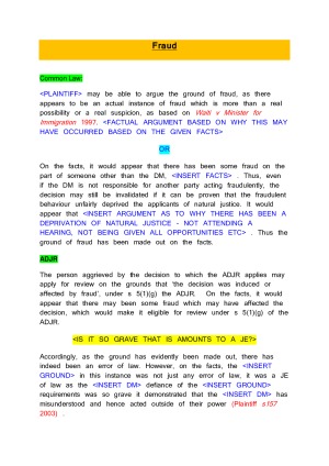 These notes are scaffold exam answers with detailed explanations of the cases. They cover all of the examinable topics and resulted in a Distinction exam result 24/30. The notes were built up from all the required and recommended readings throughout the semester. Not only are they great for the exam, but they will assist you in understanding the structure of the subject, assignment and contents for in class participation. Topics Covered - Jurisdiction -Justiciability -Standing -Grounds of Review -Procedural Fairness -Relevant Considerations -Irrelevant Considerations -Improper Purpose -Bad Faith -Fraud -Inflexible Policy -Procedural Error -Unauthorised Delegation -Acting under dictation -No evidence -Unreasonableness -Irrationality -Uncertainty -Abuse of Power -Privative Clause -Remedies