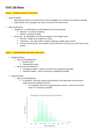 I created these notes as a way to simplify concepts and take out all the 'waffle' of content they teach but is not testable. These notes are concise and straight to the point. They simply tricky concepts and help spell out the basics so you can understand the complex concepts. These notes cover chapters 1 -10: - Week 1: Introduction to Statistics - Week 2: Summarising and Displaying Data - Week 3: Summarising and Displaying Data Cont. - Week 4: Introduction to Distributions: the Normal Distribution - Week 5: Sampling Distributions and Confidence Intervals for Proportions - Week 6: Means - Week 7: Hypothesis Tests for a Population Means - Week 8: Comparing Population Means - Week 9: Simple Linear Regression PT 1 - Week 10: Simple Linear Regression PT 2 I got a distinction in this subject - and these notes got me there! Good luck to you all :D
