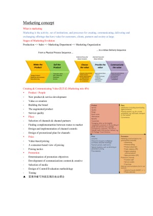 This is a complete notes cover all topics in the semester with diagrams and explanation and there is some notation for deeper understanding. Key points are highlighted. There are also some Chinese notation which might helpful for Chinese student to get better understanding about the materials. The most important thing I have to mention is that these notes are really helpful for myself because my review in final period mainly depended on it. Topics are: -Marketing concept -Value Creation -The Market-Oriented Firm -Relationship Marketing & Customer Loyalty -Customer Behavior -Market Segmentation & Targeting -Positioning and Branding -Product Life Cycle -Product Development -Marketing Communications -Pricing -Distribution Channels -Service Marketing –differences & solutions -Service Marketing –Service failure & recovery -Marketing Ethics