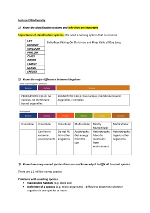 These notes cover all the lectures: - Biodiversity - Darwinian Evolution - Evolution of Earth and Biogeography - Major transitions and macroevolution - Species and speciation - Phylogenetics and systematics - Molecular basis of inheritance and the central - Mendelian genetics - Mapping - Genomes and transcriptomes - Biotechnology - Population genetics - Mechanism of evolution - Evidence for evolution and comparative anatomy - Sex and single chromosome - What it means to be a single cell - Energy production and the evolution of endosymbionts - What it means to be multicellular - How to build a plant - How to build an animal - Moving onto land - Adapting to a changing world These were structured following the learning outcomes and therefore address all important content that will really help you do well in the unit.