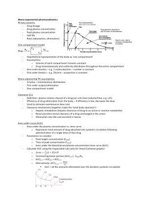 - Comprehensive and concise set of notes for all lecture material covered in Sydney University PHAR2813 (2014) - contains everything on 32 pages so no need to memorise hundreds of pages of lecture slides - Written in point form, and includes graphs, tables and equations to facilitate understanding and memory - Lecture content has been summarised and re-worded, and diagrams have been explained - all the work has been done for you (especially for pharmacokinetics)! - Enabled me to obtain an HD for this subject. - Topics covered include: pharmacokinetics (mono- and multi-exponential) and relevant equations/calculations, IV infusions, multiple dosing, ADME, bioequivalence, non-linear PK, pharmacodynamics, pharmacogenetics and metabolising enzymes, PG screening, drug transporters, drug receptors, adverse drug reactions, variability in response to medicines, therapeutic drug management, pharmacoepidemiology, confounders, bias and systematic errors, drug exposure, revision questions, etc. - Note: does not include the separate mathematics portion of this subject