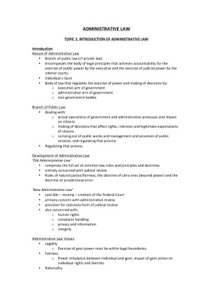 Clear and comprehensive notes on all topics covered in the subject (with table of contents for easy navigation). Consist of lecture materials, additional note taking and research, summary of all the major cases and important concepts. Essential for the exam. Topics covered: 1. Introduction 2. Statutory Interpretation 3. Merits Review 4. Introduction to Administrative Decisions (Judicial Review) Act 1977 5. Other Tribunals 6. The Ombudsman 7. Freedom of Information 8. Integrity Branch 9. Judicial Review 10. Imp sediments to Judicial Review 11. Remedies 12. Errors of Law 13. Grounds of Review 14. Procedural Fairness (Hearing Rule) 15. Procedural Fairness (Bias Rule) 16. Other Grounds 15. Privative Clauses