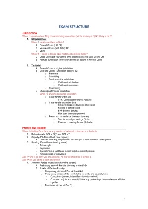 This is an easy to read summary sheet that I put together to go alongside my comprehensive notes. It provides a clear break down of each topic, trigger scenarios and issues under each topic that should be considered and/or checked off. It helped me secure an excellent exam grade and an overall HD mark. Please note this is just a 5 page summary sheet, for more detail please see my comprehensive notes also for sale. TOPIC LIST: 1. Jurisdiction 2. Joinder of parties 3. Joinder of claims 4. Commencing proceedings, service and appearance 5. Defining the issues in dispute 6. Interlocutory applications 7. Gathering Evidence NB: no Class Actions on summary sheet because our focus was policy. 8. Disposition of disputes - settlement, disposition and trial 9. Costs