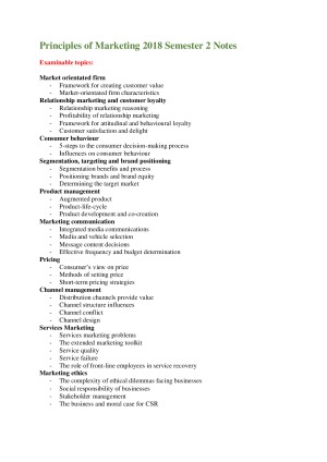90+ Marketing Exam notes - Easy-to-read formatting - Explains complicated concepts in detail - Connects different topics together like would be seen in the final exam - Notes incorporate all course material (from lectures, tutorial, and readings). - Up-to-date as of sem 2 2018 - Crammable in 2-3 days - Written by a high H1 average student on Dean's Honour List Topics covered: - Introduction to the Marketing concept - The Market Orientated Firm & Value Creation - Relationship Marketing & Customer Loyalty - Customer Behavior - Segmentation & Targeting - Positioning & Branding - Product Development & Life Cycle - Marketing Communications - Pricing - Distribution Channels - Services Marketing - Marketing Ethics