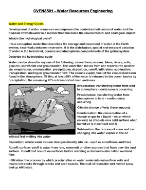 These notes cover all lectures of hydrology and groundwater and follow the new trimester structure introduced. I got a mark of 91 in this course. The notes are in a question and answer style format (using my own questions) so students can test themselves while learning content. Topics include: - Water and Energy cycles - Meteorological Variables and Evaporation - Climate Variability and change - Rainfall and streamflow measurements, Rainfall estimation - Catchment delineation and water balance - Losses, rainfall-runoff modelling basics - Flood Frequency Analysis - IFD relationships, temporal patterns and design floods - Regional frequency analysis, rational method - Unit Hydrograph for flood estimation - Introduction to Groundwater Resources and Darcy’s Law - Borehole types and construction - Groundwater flow calculations - Groundwater in Australia - Aquifer Storage Properties - Pumping test analysis and groundwater in Australia - Groundwater surface water interactions