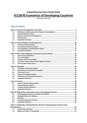 Comprehensive exam study guide that includes all lecture material and readings that can be tested on the final exam. Topics: 1. Economic Development: Overview 2. Growth Models and Development 3. Rural Urban Migration and Dual Economy Models 4. Inequality 5. Poverty 6. Malnutrition and Health Issues in Developing Countries 7. Gender Bias, Missing Women, Women's Empowerment and Economic Development 8. Progress on Millennium Development Goals and Start of Sustainable Development Goals 9. Development and Climate Change