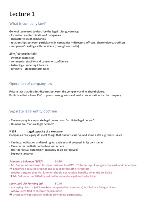 This notes include detailed notes from lecture and textbook content with reference to statutes and case laws. Very relevant for students taking this subject in 2019! :) Topics include: Introduction to company law Setting up companies Disclosure requirements Decision making in companies Member meetings Irregularities Members' statutory rights and remedies Director duties - care, insolvent trading, good faith, related party transactions Corporate groups Dividends and capital maintenance Variation of class rights Transacting by companies Please feel free to contact me for more details.