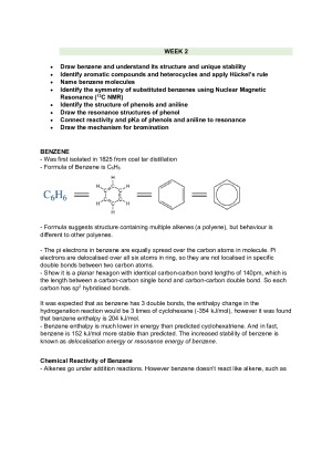 These are VERY comprehensive and detailed notes that cover all the material you need to know in CHM1022. The notes are 92 pages in total, but be reminded that this covers all the content from lectorials and tutorials. The notes go through the content of each week in the semester throughout organic and inorganic chemistry. I was able to use these notes to my benefit in every assessment, and I was able to achieve HD in this unit. The notes include written theory, many diagrams which help to understand the material, and a few sample questions and how to solve them. These notes are definitely a great supplementary guide in addition to lectorial and tutorial exercises which will definitely improve your understanding of CHM1022 :) Topic list: - Intro to organic chemistry - Aromatic compounds - Ketones and Aldehydes - Organic stereochemistry - Acids, esters, amides and polymers - Chemical detectives - Intro to inorganic chemistry - Compounds and Complexes - Ligands - Inorganic stereochemistry, Crystal Field Theory - Colour and Magnetism of Inorganic Complexes - Biological Applications to Inorganic Chemistry