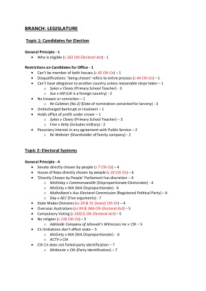These are the notes that I used to get a 91 HD in APL. Table of Contents is Included at Bottom of Summary Topics Include: - Candidates for election - Electoral Systems - Right to Vote - Parliamentary Supremacy - State Constitutions and Parliamentary Power - Manner and Form - Delegation and Abdication of Legislative Power - Parliamentary Privilege - Justiciability of Parliamentary Power - Validity of Legislature Provision and Delegated Legislation - The Executive Branch - The Executive Power - Nature of Judicial Power - Exceptions to Boilermaker's - State Courts and Kable