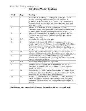 Comprehensive for all of the weekly readings that go beyond simply answering the questions. The readings are as follows (and align with the 2019 unit guide): Bukowski, W, M. Motzoi, C., & Meyer, F. (2009; 2014 ebook edition). Friendship as Process, Function and Outcome. In , Bukowski, & B. Laursen, (Eds.). Handbook of peer interactions, relationships, and groups. Guilford Press; New York, pp. 217–231. Mikami, , Boucher, , & Humphreys, K. (2005). Prevention of peer rejection through a classroom-level intervention in middle school. Journal of Primary prevention, 26 (1), 5 - 23. Swearer, S., Espelage, & Napolitano, (2009). Bullying Prevention and Intervention. Guilford Press, New York. (Read Chapter 1 pp. 1- 14) No reading this week due to the quiz. McGrath, H. & Stanley, M. (2006). A comparison of two non-punitive approaches to bullying, in H. McGrath and T. Noble (Eds), Bullying solutions: evidence-based approaches to bullying in Australian schools, pp. 189-201, Pearson Longman, Frenchs Forest, Masten, (2010). Ordinary Magic: Lessons from research on resilience in human development. Education Canada, 49(3), 28- 32. Department of Education and Early Childhood Development, Victoria State Government (2015) Building Resilience: Social and Emotional Learning Materials. No readings due to professional experience Readings selected from the new Be You website: the national framework for mental health and wellbeing for children, young people and teachers. Rubie-Davies, C. (2008). Teacher Expectations. In T. Good (Eds.) 21st Century Education: A Reference Handbook. (pp. I-254- I-265). Thousand Oaks, California: Sage Publications Inc. Allen, K. A., Vella-Brodrick, D., & Waters, L. (2016). Fostering school belonging in secondary schools using a socio-ecological framework. The Educational and Developmental Psychologist, 33, 97–121.