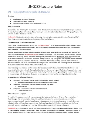 Includes notes from wks 1-10 (remaining weeks don't have lectures but are used to work on assessment) Notes for readings are including for majority of the weeks. These notes will definitely guide and help you in completely the 2 major assessment task. Course Outline W1 - Institutional Communication & Discouse W2 - Approaches to Discourse Analysis W3 - Analaysing Interaction W4 - Welding Power W5 - Features of Interaction W6 - Written Communication - Genres & Structures W7 - Written Communication - Language & Language Choices W8 - Multimodal Communication W9 - impression Management W10 - Trust and Rapport