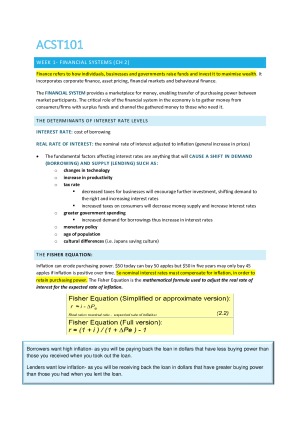 Received a high distinction for this subject. Notes include all lectures from 2018 Semester One Also at the end of the document I've attached my cheat sheet/summary I used for the final exam. Summaries for weeks: 1: The Financial System 2: Time Value of Money 3: Time Value of Money (Necessary formulas are given) 4: (continuation of Time Values) 6: Bond Valuation 7: Share Valuation 8: Capital Budgeting 9: Risk and Return 10: (N/A - Class Test) 11: Raising Capital 12: The Global Financial Crisis