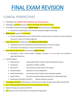 Study notes covers all topics covered in PSYC1001 during Term 1, 2019 from textbook, lecture and tutorial material. Subjects cover are as follows: Clinical Perspectives Social Psychology Developmental Psychology Emotion and Motivation Personality Consciousness Health Psychology Cultural Psychology Important information covered in exams have been highlighted to assist with both mid-term and final exam preparation.