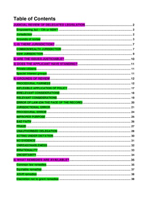 A comprehensive scaffold ready to use in exam. Covers judicial review of delegated legislation. Covers following elements/ topics: 1. Is there jurisdiction? 2. Are the issues justiciable? 3. Does the applicant have standing? 4. Grounds of review 5. What remedies are available? HD mark in exam